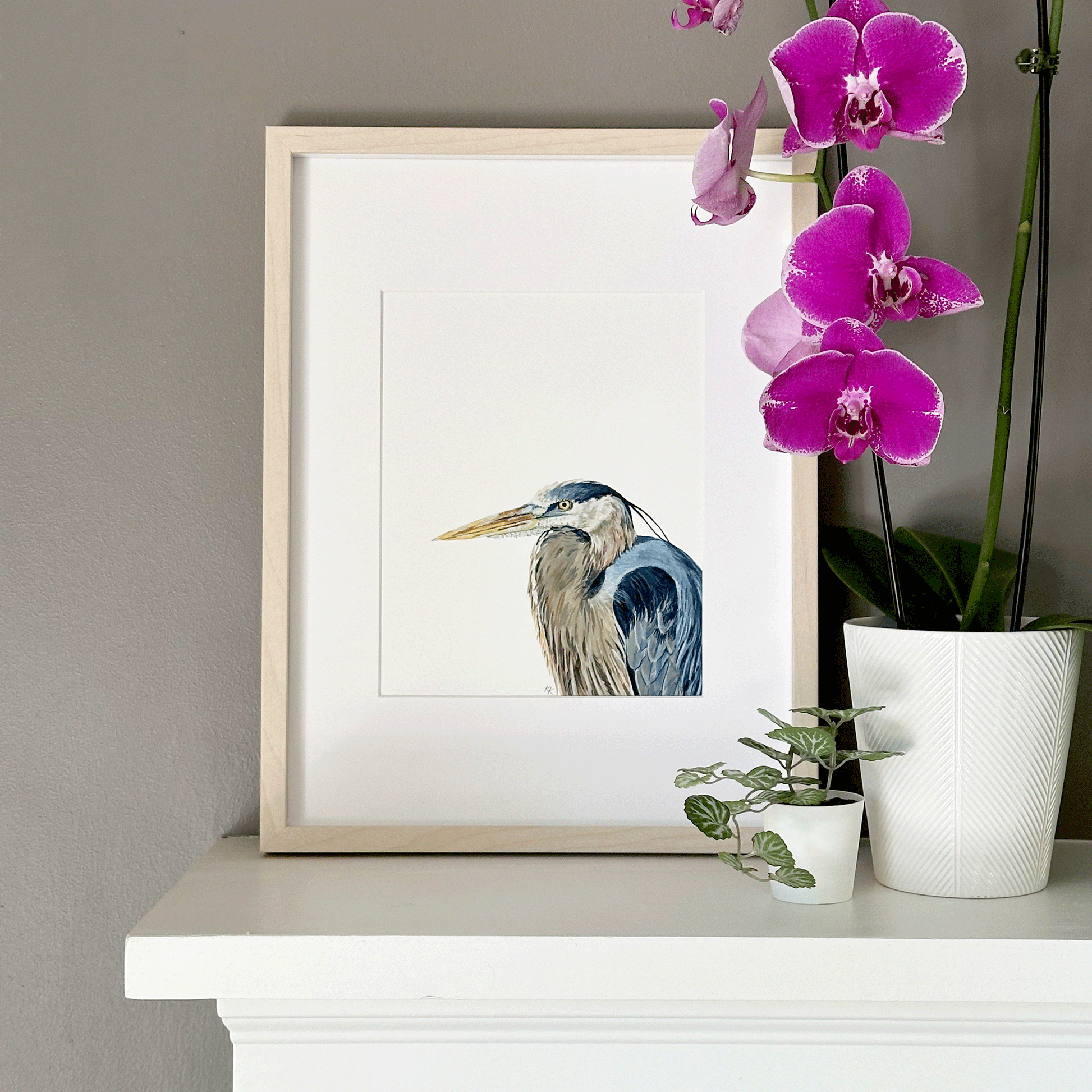 To achieve high-quality reproductions of the original paintings, my studio uses an archival museum-grade method of printing known as giclée. The Birds of a Feather collection is reproduced on a cold press natural 100% cotton rag media with a heavy weight of 340 gsm, free of acid, lignin, chlorine, and optical brightening agents. The media has a natural warm tone with a lovely texture that looks and feels like the original painting.