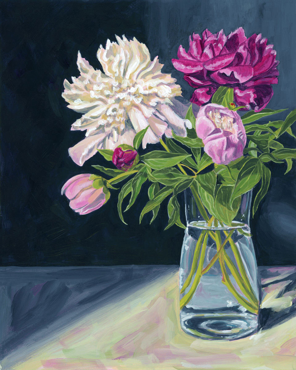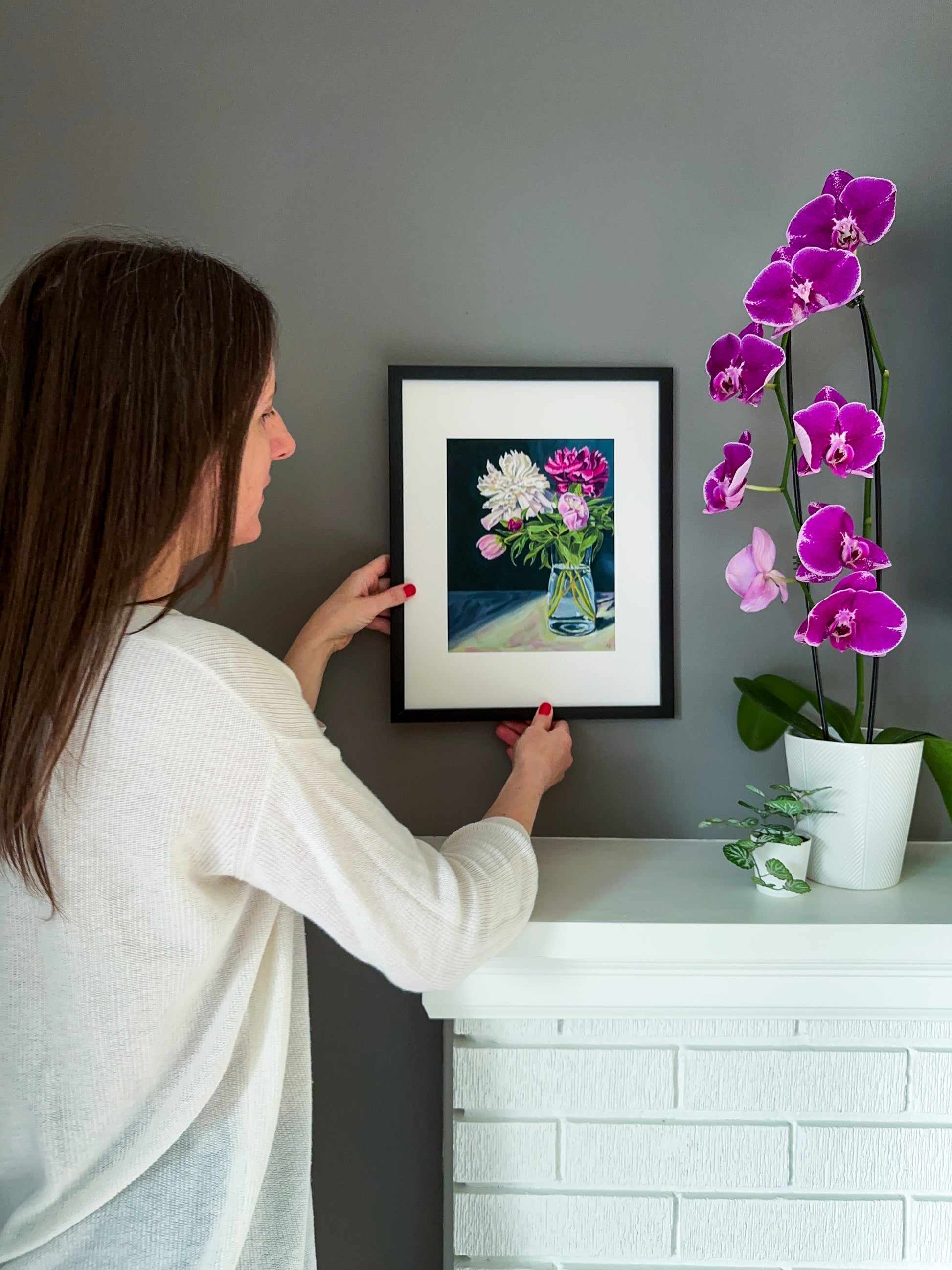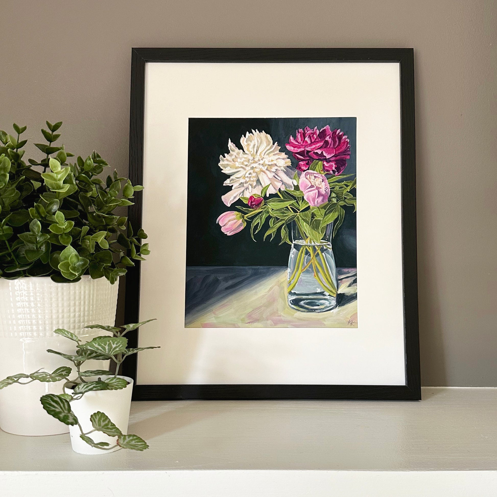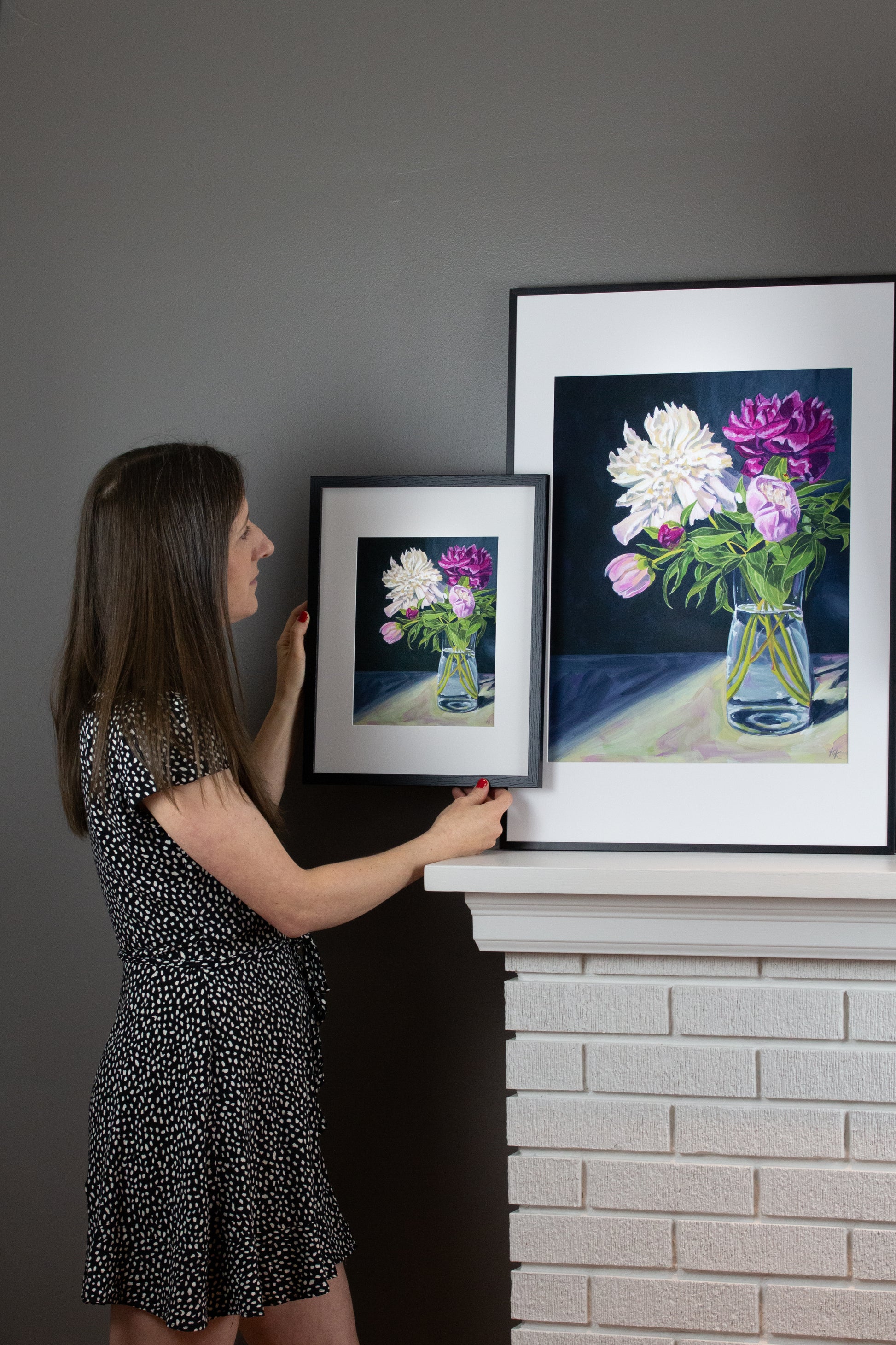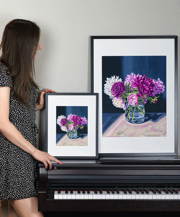To achieve high-quality reproductions of the original paintings, my studio uses an archival museum-grade method of printing known as giclée. The Peony collection is reproduced on a cold press natural 100% cotton rag media with a heavy weight of 340 gsm, free of acid, lignin, chlorine, and optical brightening agents. The media has a natural warm tone with a lovely texture that looks and feels like the original painting.